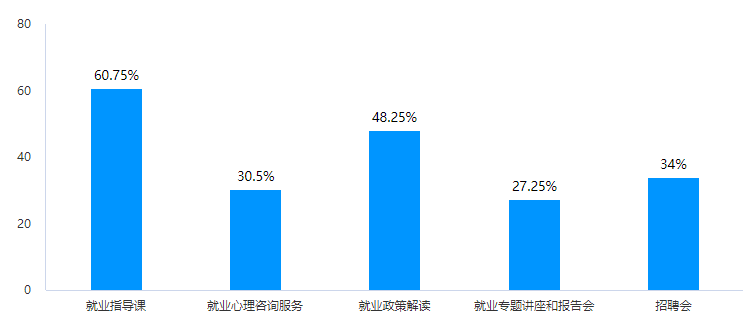 在对学校提供就业帮扶方式的调查中发现(图3),就业指导课程占比最大,达60.75%,其他方式占比由高到低分别为:学校解读就业政策(48.25%)、举办招聘会(34%)、就业心理咨询服务(30.5%)及就业辅导讲座和报告会(27.25%)。上述结果可看出,员工对学校提供的多样化就业帮扶均表现出一定的需求。面对日益复杂的就业形势和职业发展需求,高校毕业生亟需全方位、个性化的职业指导服务,但目前高校职业指导体系建设还不够健全,难以满足员工的多元化需求,高校需注重就业理论指导与实际就业技能训练相结合。