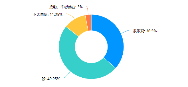 调查结果显示,85.75%的员工面对就业时心态较为平稳,但是仍有少部分员工对就业表示不自信或者抵触,在调查中,36.5%的员工显示出乐观的态度,49.25%的员工认为自己处于一般状态,11.25%的员工则显得缺乏自信,另外3%的员工表现出抵触情绪,不愿意参与就业(见图2)。由此可见,高校与就业老师应开展针对性摸排工作,向特定员工提供就业心理指导与就业技能培训等帮助。